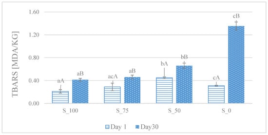 Content of secondary fat oxidation products defined as thiobarbituric acid reactive substances (TBARS) in canned pork meat with 1% CFS and reduced nitrite amount after production (day 1) and storage (4 °C; day 30). [S_100—variant with a sodium nitrite dose of 100 mg kg−1; S_75—variant with a sodium nitrite dose of 75 mg kg−1; S_50—variant with a sodium nitrite dose of 50 mg kg−1; S_0—nitrite-free variant. a–c—different lowercase letters indicate significant differences between variants within the same day; A,B—different uppercase letters indicate significant differences between days within the same variant (p < 0.05)].