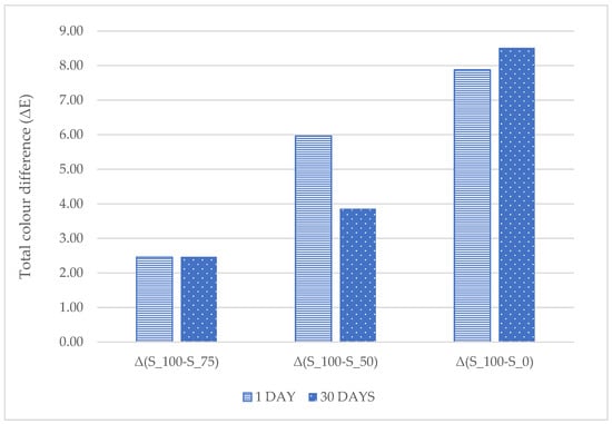 Total color difference (ΔE) between the pattern (control sample, S_100) and the remaining samples (i.e., S_75, S_50, and S_0) was calculated.