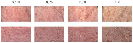 Canned pork meats with 1% CFS and reduced nitrite amount after production (day 1) (above: top view; below: cross-sectional view) [S_100—variant with a sodium nitrite dose of 100 mg kg−1; S_75—variant with a sodium nitrite dose of 75 mg kg−1; S_50—variant with a sodium nitrite dose of 50 mg kg−1; S_0—nitrite-free variant].