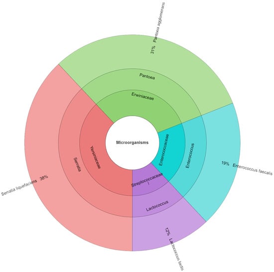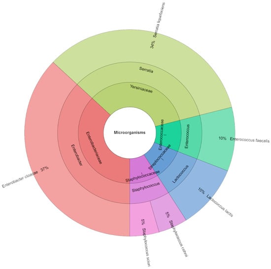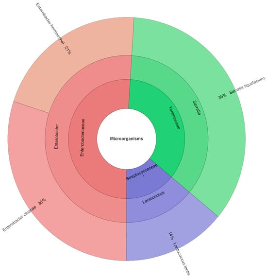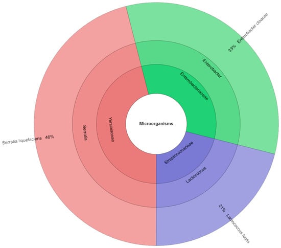 As presented in Figure 5, the family, genera, and species of bacteria isolated from canned pork in the samples of the variant with a sodium nitrite dose of 50 mg kg−1 are listed. The utilization of mass spectrometry enabled the identification of a total of 94 isolates. It was observed that the most prevalent families isolated were Enterobacteriaceae and Yersiniaceae. Following a thorough analysis, the most prevalent species identified were Serratia liquefaciens (46%) and Enterobacter cloacae (33%).