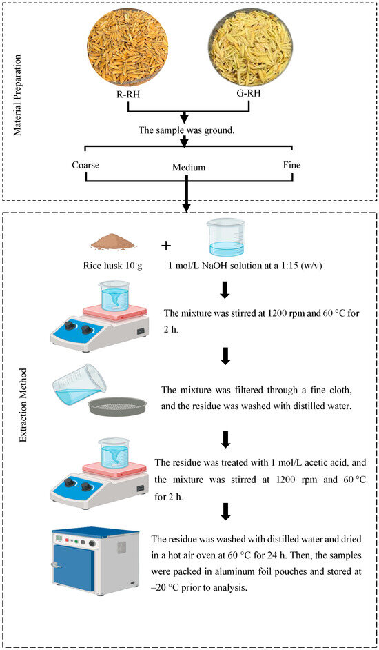 All samples were dried at 60 °C for 4 h. The dried rice husks were then ground using a blender. The ground rice husk without sieving was classified as the “coarse” fraction. The portion that passed through a 50-mesh sieve was defined as the “medium” fraction, while the portion that passed through an 80-mesh sieve was defined as the “fine” fraction. The processed samples were stored in aluminum foil bags and labeled as G-RH and R-RH for rice husks from the green rice husk and ripe rice husk, respectively. The samples were kept at −20 °C until analysis.