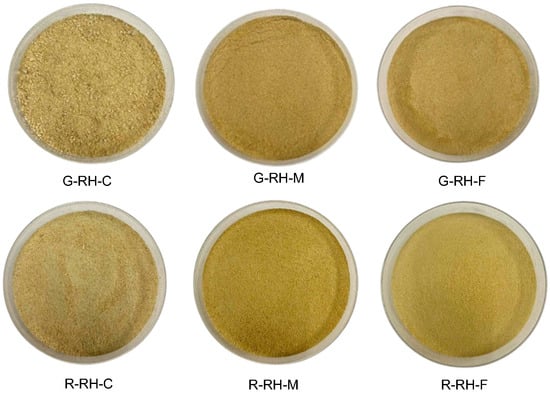 Appearance of dietary fiber obtained from rice husk. R: ripe stage; G: green stage; RH: rice husk. C: coarse; M: medium; F: fine.