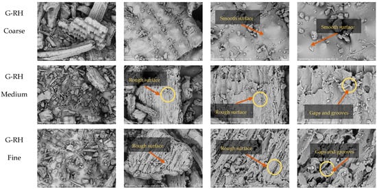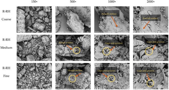 SEM images of rice husk fibers from two different maturity stages at magnifications ranging from 150× to 2000×. Observations were performed at an accelerating voltage of 10 kV. R: ripe stage; G: green stage; RH: rice husk.
