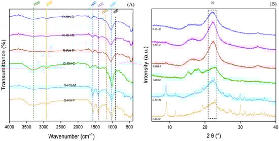 FT-IR analysis of dietary fibers from rice husk was performed to identify the functional groups present, as shown in Figure 4A. The obtained spectra reflect the structural components of polysaccharides in both G-RH and R-RH samples. A broad absorption band at 3330 cm−1 indicates the presence of hydrogen bonding within the fiber structure, associated with cellulose and hemicellulose [30]. The band at 2907 cm−1 corresponds to aliphatic C–H stretching in polysaccharides such as cellulose [38,39,40]. Bands at 1642 and 1161 cm−1 are consistent with O–H bending, often related to water absorbed in cellulose fibers [3]. The band at 1432 cm−1 is characteristic of C–H bending in the polysaccharide backbone, while bands at 1105 and 1026 cm−1 indicate C–O–C glycosidic bond vibrations in cellulose [41]. Additionally, the peak at 900 cm−1 is characteristic of β-glycosidic linkages between glucose units in cellulose [42]. These FT-IR results indicate that dietary fibers from both rice husk stages contain cellulose, and the detected functional groups reflect the polysaccharide structures that form the basis of the dietary fiber. Furthermore, the spectral data revealed that particle size influenced the intensity of light absorption. The G-RH sample exhibited stronger absorption bands than R-RH, which may be attributed to additional components such as minerals. These components may exhibit absorption in the 1100–1000 cm−1 region (due to Si–O bond vibrations), potentially overlapping with C–O stretching bands (~1020–1040 cm−1) of polysaccharides. Additionally, the presence of a peak around 3300 cm−1 further indicated O–H stretching, possibly arising from moisture retained in the samples [3]. The increased absorption intensity observed in samples with larger or coarser particle sizes could be attributed to the retention of residual compounds, such as moisture, in higher quantities. These findings show that both the developmental stage and particle size influence the chemical structure of rice husk dietary fiber, which may affect its functional properties.