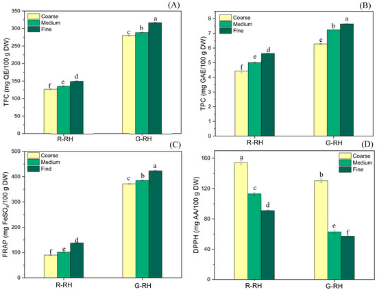 Bioactive compounds are natural substances that exert positive effects on health and physiological functions [14]. Figure 5 illustrates the influence of developmental stages and particle sizes of rice husk-derived dietary fiber on the levels of bioactive compounds and their antioxidant activities. The total flavonoid content (TFC) ranged from 125.75 to 314.94 mg QE/100 g DW (Figure 5A), which is approximately twice the amount reported for wheat bran fiber [12]. Similarly, the total phenolic content (TPC) ranged from 4.42 to 7.66 mg GAE/100 g DW (Figure 5B), which is higher than previously reported values for rice husk DW [4]. The FRAP method was used to evaluate antioxidant capacity, which ranged from 88.01 to 421.99 mg FeSO4/100 g DW (Figure 5C), with G-RH samples showing higher values than wheat bran [49]. DPPH radical scavenging activity ranged from 57.61 to 130.43 mg AA/100 g DW (Figure 5D), which is roughly double that reported for soybean hulls [24]. Comparing dietary fibers derived from different developmental stages, G-RH exhibited higher levels of TFC, TPC, and FRAP activity than R-RH, likely due to the naturally higher antioxidant compound content in earlier seed development stages [14]. Moreover, particle size had a significant impact on bioactive compound levels and antioxidant properties. As particle size decreased, TPC, TFC, and FRAP values tended to increase, following the trend fine > medium > coarse. This phenomenon may be attributed to the increased surface area of smaller particles, which enhances reactivity and facilitates the release of antioxidants [12,50]. However, DPPH activity exhibited an opposite trend, decreasing with smaller particle sizes (coarse > medium > fine). This may be attributed to the heterogeneous distribution of antioxidant compounds across different structural components of plant tissue, such as the bran layer and the aleurone layer of rice bran [14]. Moreover, the antioxidant activities measured using the FRAP assay showed a different trend from those measured by the DPPH method, which could be due to the distinct underlying mechanisms of each assay. The DPPH assay evaluates antioxidant capacity based on the ability to donate electrons or hydrogen atoms to neutralize the DPPH radical, whereas the FRAP assay measures electron-donating capacity to reduce Fe3+ to Fe2+ [51]. These differences suggest that certain bioactive compounds may respond more strongly to one assay than the other, potentially leading to variations in the observed antioxidant activity. Therefore, optimizing particle size during rice husk processing is essential not only for preserving antioxidant potential but also for enhancing the nutritional and functional properties of dietary fiber, particularly in the development of health-oriented functional food products.