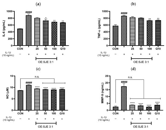Effects of OE, SJE, and the 3:1 OE-SJE combination on (a) IL-6, (b) TNF-α, (c) NO, (d) MMP-9, (e) MMP-13, and (f) hyaluronan levels in human chondrocytes. Each value is expressed as a mean ± standard error (n = 3). # p < 0.05 and #### p < 0.0001 versus the control cells; * p < 0.05, ** p < 0.01, *** p < 0.001, and **** p < 0.0001 versus the IL-1β-treated group. CON, control group; OE, oleaster fruit extract; SJE, Sophora japonica L. fruit extract; n.s., not significant.