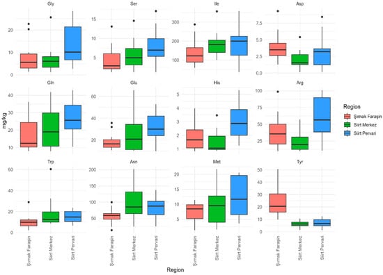 Significant regional differences were observed in the FAA profiles of honey samples from Şırnak Faraşin, Siirt Merkez, and Siirt Pervari (Table 1). Pairwise comparisons based on the Conover post hoc test revealed that honey samples from Şırnak Faraşin significantly differed from those of Siirt Merkez in concentrations of Asn (p = 0.016), Asp (p = 0.014), Tyr (p < 0.001), and Trp (p = 0.013). On the other hand, significant differences were observed between Şırnak Faraşin and Siirt Pervari for Gly (p = 0.013), Ser (p = 0.036), Ile (p = 0.043), Asn (p = 0.016), Asp (p = 0.014), Gln (p = 0.024), Glu (p = 0.010), Met (p = 0.047), His (p < 0.001), Arg (p = 0.001), Tyr (p < 0.001), and Trp (p = 0.013). Comparatively fewer differences were observed between Siirt Merkez and Pervari, limited to Gly (p = 0.013), His (p < 0.001), and Arg (p = 0.001) (Table 1, Figure 2). These patterns align with previous reports of the FAA variation across geographical origins, such as floral honeys from Argentina [21] and honeydew honeys from Brazil [60], reinforcing the utility of FAA profiling as a marker of origin.