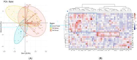 Principal Component Analysis biplot and heatmap visualization of FAA profiles in honey samples from three regions. (A) PCA biplot of FAA profiles. (B) Heatmap visualization of FAA concentrations. (F) Şırnak Faraşin, (S) Siirt Merkez, and (P) Siirt Pervari. Color intensity reflects relative abundance, with red indicating higher and blue indicating lower concentrations. (A) shows the location where Siirt honey is clustered, (B) shows the location where Şırnak Faraşin honey is clustered.