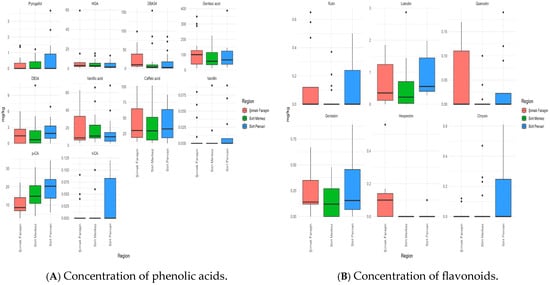 Box plots comparing the concentrations of individual phenolic acids (A) and flavonoids (B) in honeys. The line within the box indicates the median, the boxes indicate Q1 and Q3, the lines indicate the minimum and maximum values, and the dots indicate outliers.