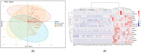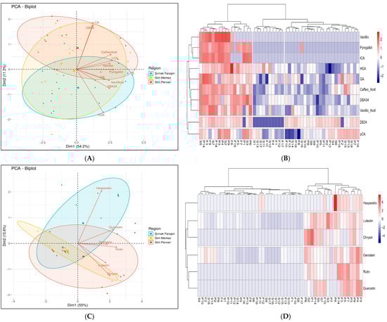 To visualize the complex relationships between the 16 quantified phenolic compounds and the geographical origin of the honeys, the PCA and heatmap visualization were performed separately for the phenolic acid and flavonoid profiles, as well as for the combined data set, to identify the key drivers of regional differentiation.
