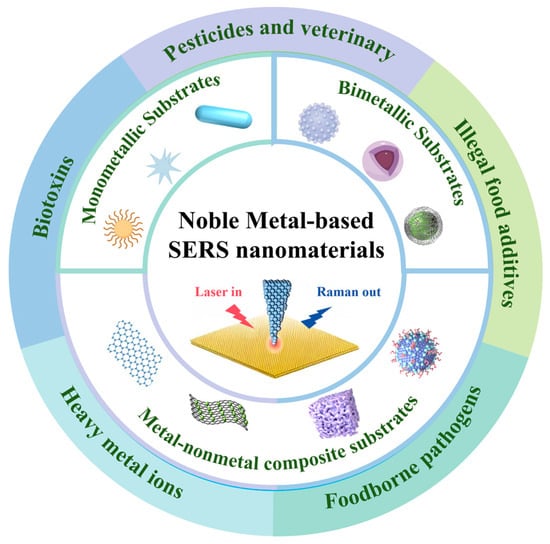 Classifications of noble metal-based SERS nanomaterials and their applications in food contaminants detection.