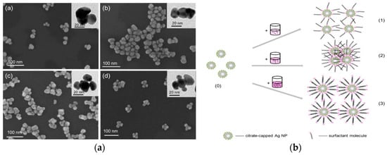 (a) Morphological characterization of Au nanoflowers [28]. Copyright Nanomaterials, 2021. (b) Cationic surfactants induce the aggregation of silver nanoparticles [32]. Copyright Microchemical Journal, 2021.
