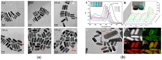 (a) Morphological characterization of AuNRs@Ag [36]. Copyright Sensors and Actuators B: Chemical, 2021. (b) Morphological characterization of Au@Ag NRs with the different addition volume of AgNO3 (A: UV–vis spectra and B: SERS spectra of Au@Ag NRs with the different addition volume of AgNO3 C and D1–D4: TEM spectra of Au@Ag NRs) [37]. Copyright Food Chemistry, 2022.