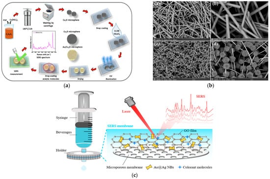 (a) Construction process of Au/Cu2O based SERS substrates for detection of RhB and MB [46]. Copyright Applied Surface Science, 2022. (b) Morphological characterization of AgNWs and AgNWs@ZIF-8 [49]. Copyright Food Chemistry, 2022. (c) GO/Au@Ag NBs-based SERS substrates for enrichment and detection of colorants in beverages [50]. Copyright Sensors and Actuators B: Chemical, 2021.