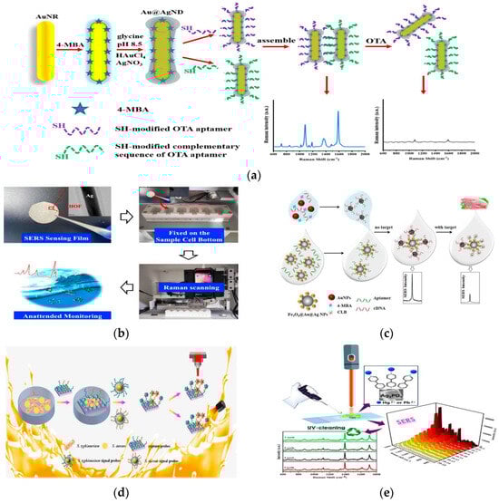 (a) Au@Ag nanodumbbell based inter-nanogap SERS aptasensor for the detection of OTA [71]. Copyright Analytica Chimica Acta, 2021. (b) Based on AgMW@HOF SERS substrates for detecting BPE [76]. Copyright Chemical Engineering Journal, 2024. (c) SERS-based aptasensor for the detection of clenbuterol hydrochloride [78]. Copyright LWT, 2020. (d) ZnO/Ag-Au@Ag SERS probes to detect S. typ and S. aureus [81]. Copyright Analytica Chimica Acta, 2025. (e) Ag3PO4/SWCNT as efficient SERS substrate for detecting Hg2+ and Pb2+ [82]. Copyright Journal of Colloid and Interface Science, 2022.