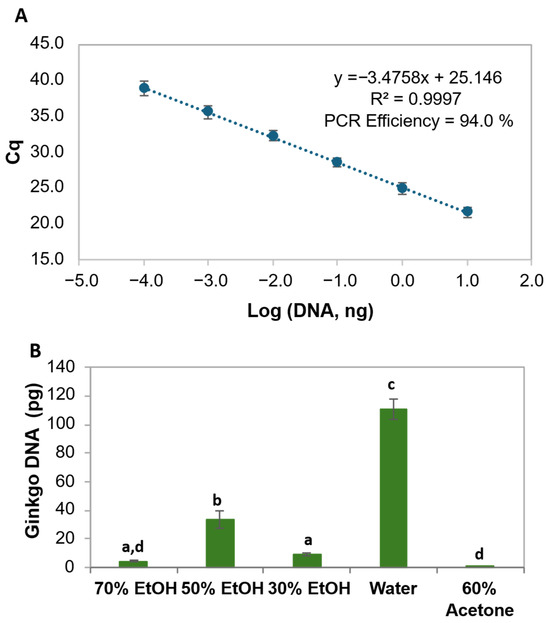Calibration curve of real-time PCR with a hydrolysis probe targeting the ITS1 region of G. biloba using 10-fold serially diluted ginkgo DNA (20 ng to 0.2 pg) (n = 10 replicates) (A). Mean ginkgo DNA content ± standard deviation (SD) (n = 4 replicates from 2 independent assays) of ginkgo leaf extracts obtained with different solvents: three ethanol/water (EtOH) concentrations (30, 50 and 70%), 60% of acetone/water (B). Different letters mean statistically significant differences among the extraction methods (p < 0.05), following ordinary one-way ANOVA. Cq, cycle of quantification.