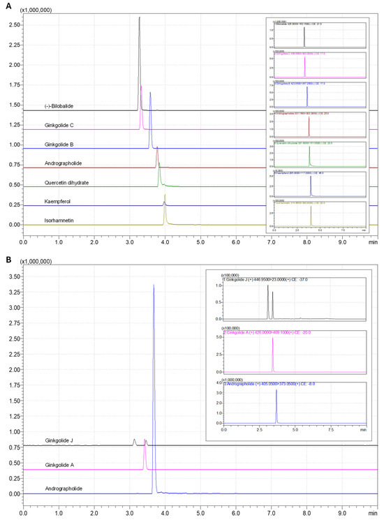 Overlaid and individual chromatograms of the compounds analyzed in the negative ionization ((-)-bilobalide, ginkgolide C, ginkgolide B, andrographolide, quercetin dihydrate, and kaempferol) (A) and positive ionization (andrographolide, ginkgolide J, and ginkgolide A) (B) modes. The concentration of the analyzed compounds was 1 mg/L, except for andrographolide (10 mg/L).