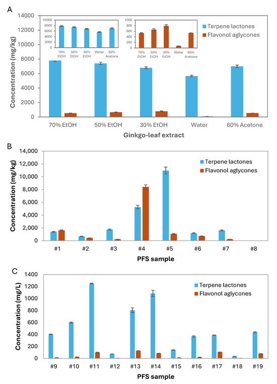 Total contents of terpene lactones and flavonol aglycones analyzed by UHPLC-MS/MS obtained from dried ginkgo leaf extracts using different solvents (30, 50 and 70% of ethanol/water (EtOH), water and 60% of acetone/water) (different letters for the same solvent extraction mean statistically significant differences among the extraction method (p < 0.05), following ordinary one-way ANOVA) (A), solid (B) and liquid (C) PFS samples. Values are triplicates (mean ± SD) from 3 independent runs per system.