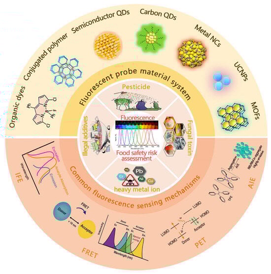 To address the limitations of traditional methods, various rapid detection techniques have been developed [10,11,12], among which fluorescence sensing analysis has stood out as one of the most dynamic research areas [13,14,15]. The technique utilizes measurable changes in the probe photophysical properties (e.g., fluorescence intensity, wavelength, lifetime, polarization state) induced by the interaction of a target analyte with a fluorescent probe molecule to achieve detection [16,17]. Their core strengths are unparalleled sensitivity (theoretically up to the single-molecule level), a nanosecond response time, non-invasiveness, and visualization capabilities through fluorescence imaging [18,19]. Material systems for fluorescent probes have also undergone significant development (Figure 1), from the initial organic small-molecule dyes [20,21] to conjugated polymers [22,23,24,25], semiconductor quantum dots (SQDs) [26,27,28], fluorescent carbon dots (CQDs) [29,30,31,32], metal nanoclusters (NCs) [33,34,35], rare-earth-element-based upconversion nanoparticles (UCNPs) [36,37,38,39], and metal–organic frameworks (MOFs) [40,41], among others. In addition, common fluorescence sensing mechanisms include Förster resonance energy transfer (FRET) [42,43,44,45], the internal filtering effect (IFE) [46,47], photoelectron transfer (PET) [48,49], and aggregation-induced luminescence (AIE) [50], which provide a rich toolbox for different application scenarios [51,52].