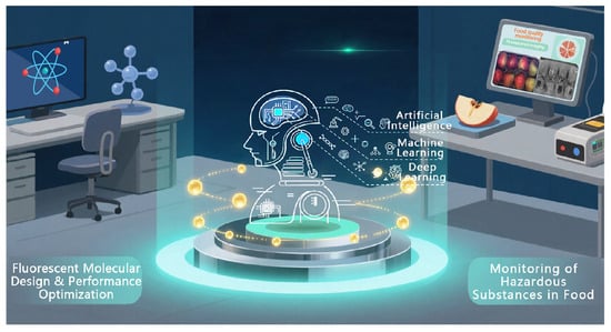 However, despite the many achievements, fluorescence sensing technology has been plagued by two systematic bottlenecks on its way to truly widespread and reliable practical applications. First, the development of traditional probes is highly dependent on the “chemical intuition” and experience of chemists [53,54], through the iterative cycle of “hypothesis–synthesis–test–correction”, which is a trial-and-error approach [55,56]. In the face of thousands of food safety hazards and increasingly stringent requirements on probe performance (e.g., near-infrared emission to penetrate biological tissues, high selectivity for specific ions, high quantum yield in aqueous phases), it is a great challenge for synthetic chemistry and materials science to move away from serendipitous discovery and achieve the functionally oriented and predictable rational design of molecules [57]. Secondly, food samples are known to be “dirty” matrices containing endogenous substances such as proteins, fats, pigments, vitamins, etc., which can cause background fluorescence, absorption or scattering interference [58], which is difficult to avoid [59,60] despite the fact that ratiometric fluorescent probes have been designed to reduce the matrix interference effect [61,62,63]. In addition, when multiple structurally similar analytes coexist, the probes tend to exhibit cross response, making it difficult to distinguish between analyses of a single signal dimension [64,65]. These issues can lead to compromised accuracy, context-dependent reproducibility, and elevated false-positive rates under demanding field conditions in practical applications [66].