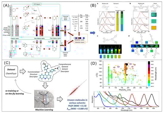 Sungnam Park et al. introduced a deep learning model based on GNN for chromophore–solvent interactions (Figure 3A), which accurately and reliably predicted the optical and photophysical properties of organic compounds (Figure 3B) [98]. Cheng-Wei Ju et al. established a database containing over 4300 solvated organic fluorescent dyes and developed a new machine learning method (non-GNN) to predict emission wavelengths and photoluminescence quantum yields (PLQY) (Figure 3C). Evaluation using unseen molecules showed that this model is comparable to time-dependent density functional theory (TD-DFT) calculations [99]. Voznyy et al. utilized machine-learning-in-the-loop (non-GNN) to learn from available experimental data [100] and propose experimental parameters to try, and, ultimately, point to regions of synthetic parameter space that will enable record-monodispersity PbS quantum dots (Figure 3D). Additionally, its prediction speed is improved by five to seven orders of magnitude compared to DFT calculations, from hours/days to milliseconds [101]. This amazing efficiency makes comprehensive screening in a chemical space containing hundreds of millions or even billions of virtual compounds a reality [102]. In addition, DL models can predict the binding affinity of molecules to specific targets (e.g., protein active sites, nucleic acid sequences) [103,104], enabling truly functionally oriented design [105].
