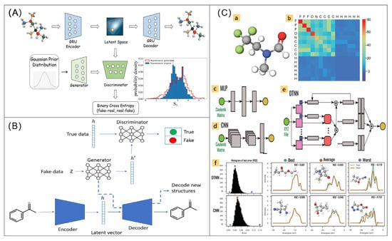 (A) De novo creation of fluorescent molecules via adversarial generative modeling. The figure was reproduced from [112], with permission from Royal Society of Chemistry, 2023; (B) LatentGAN which combines an autoencoder and a generative adversarial neural network for de novo molecular design. The figure was reproduced from [113], with permission from the BMC, 2019; (C) Predicting molecular excitation spectra based on Machine learning and deep learning models. (a) Atomic structure of the N-methyl-N-(2,2,2-trifluoroethyl)formamide molecule and (b) its corresponding Coulomb matrix representation. Canonical illustration of the three neural network types: (c) the multilayer perceptron (MLP); (d) the convolutional neural network (CNN); and (e) the deep tensor neural network (DTNN). Green circles to the left represent the molecular input and yellow circles to the right the output (here 16 excitation energies or the molecular excitation spectrum). The gray blocks are schematics for fully connected hidden layers, convolutional blocks, pooling layers, and state vectors. Nodes corresponding to atom types in the DTNN are represented as blue squares and the distances matrix between different atoms as pink squares. Parameter tensors (red squares) project the vectors encoding atom types and the interatomic distance matrix into a vector with same dimensions as the atom type encodings. The DTNN is evaluated iteratively, building up more complex interactions between atoms with each iteration. (f) Comparison of CNN and DTNN spectra predictions: the first column depicts RSE histograms for 13 000 test molecules from the 132k dataset. The following three columns show the spectra of the best, an average, and one of the worst predictions compared to the corresponding reference spectrum. The colored circles mark the histogram positions of the selected molecules. The figure was reproduced from [114], with permission from Wiley, 2019.