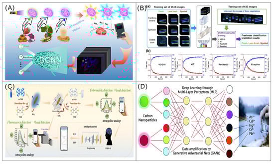 (A) Deep learning-assisted flavonoid-based fluorescent sensor array for the nondestructive detection of meat freshness. The figure was reproduced from [152], with permission from Elsevier, 2024; (B) Fluorescent sensor array combined with DCNN model for freshness prediction of three vegetables. (a) Flowchart of DCNN for freshness prediction. (b) Training loss and training accuracy of the four DCNN models decrease and increase with the increase of training epochs. The figure was reproduced from [153], with permission from Elsevier, 2024; (C) Nanozyme-induced deep learning-assisted smartphone integrated colorimetric and fluorometric dual-mode for detection of tetracycline analogs. The figure was reproduced from [149], with permission from Elsevier, 2024; (D) Generative Adversarial Nets (GANs) assisted detection of toxic heavy metal ions based on visual fluorescence responses from a carbon nanoparticle array. The figure was reproduced from [142], with permission from Royal Society of Chemistry, 2022.