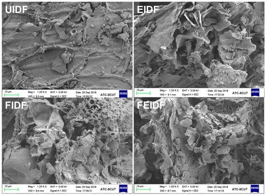 The scanning electron micrographs of IDF prepared from rice bran using different processing methods are displayed in Figure 1. The UIDF structure of untreated rice bran presents irregular small flakes, and the surface is dense and smooth. Compared to UIDF, EIDF and FEIDF exhibits more uneven and irregular rough cracks; they are similar in structure, composed of a large number of fragments, and the surface is wrinkled, forming larger cavities and obvious cracks, thus having a larger specific surface area. In addition, FIDF exhibits a more porous and wrinkled surface structure in comparison with UIDF. This observed disruption of the flake structure is consistent with previous reports [13,31] suggesting that such processing can lead to fiber degradation, a reduced polymerization degree, and a fragmented molecular morphology. Prior studies indicate that extrusion treatment can disrupt the rigid structure of bran cell walls, facilitating the action of native cell-wall-hydrolyzing enzymes (e.g., xylanase) to easily permeate the cell wall structure [8,32]. In fermented wheat bran, it was found that some of the cell walls in the bran were partially destroyed. The higher binding and adsorption capabilities of the processed IDF samples were attributed to increased binding-site exposure as a result of surface and microstructure modifications.