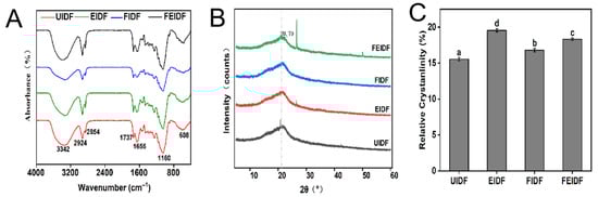 Figure 2A presents the FTIR spectrum of IDF from rice bran, covering the range of 400 to 4000 cm−1, and illustrating its functional groups. Rice bran IDF samples had similar characteristic bands, but their absorbance and/or wavenumbers changed. The broad peak around 3400 cm−1 corresponds to the –OH bond in hydrogen and hydroxyl groups, primarily originating from cellulose and hemicellulose. FIDF and FEIDF show a notable blue shift in this frequency range compared to UIDF, likely due to the disruption of hydrogen-bonded organic molecules [33,34]. The results indicate that extrusion and fermentation expedite the breakdown of cellulose and hemicellulose, thereby further weakening the hydrogen bonds between their molecules. This process may expose functional groups more, altering their chemical and physical properties [35]. For example, the peak at 1640 cm−1 may correspond to the aromatic benzene in lignin, with the peak intensities being weaker in all processed IDF samples compared to the unprocessed one, implying a potential conversion of lignin to smaller phenolic compounds [36]. Meanwhile, the peak at 905 cm−1 has been identified as the characteristic region for carbohydrates bearing C-O-C and C-O-H stretching vibrations, implying the alternation of β-glycosidic bonds [2]. The bands observed at 2925 and 2854 cm−1 correspond to C-H vibrations in methyl and methylene groups. The absorption peaks of FIDF and EIDF were stronger than those of the other two, indicating that the content of soluble carbohydrates was increased here, and the two pretreatment effects were better. The band at 1655 cm−1 indicates a hydrogen bond between cellulose and water molecules. Compared to UIDF, the peak intensity of FIDF is weaker, indicating that the hydrogen bonds between cellulose and water molecules have been broken. These results align with the adsorption peak at 3400 cm−1 [13]. The band at 1160 cm−1 represents the characteristic peak of polysaccharides, and the peak intensity was decreased after rice bran was extruded and fermented. This may be due to the destruction of the glucoside bond in cellulose during the pretreatment of rice bran, leading to the destruction of the cellulose structure [37,38]. Consequently, extrusion and fermentation pretreatment can degrade cellulose and hemicellulose, change the microstructure of IDF, and improve its water solubility.