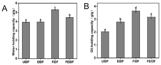 Regarding the OHC range of the four kinds of IDF at 2.04–3.64 g/g, compared with UIDF, the OHCs of EIDF, FIDF, and FEIDF increased by 36.76, 78.43, and 55.39%, respectively (p < 0.05). Different processing treatments notably enhanced the OHC of rice bran IDF, with fermentation showing the most pronounced effect on rice bran IDF [26]. Similarly, microfluidization treatment significantly improved the OHC of IDF from bamboo shoot shell. The enhancement in OHCs of EIDF, FIDF, FEIDF could be primarily attributed to the development of a porous structure and increased surface roughness, as clearly observed in the SEM images (Figure 1). These structural modifications are expected to increase the specific surface area and the number of potential sites available for oil binding and entrapment [26,46,47]. Through physical processing, the starch and part of the hemicellulose in the IDF can be gradually destroyed, making the IDF’s affinity to the oil group, specific surface area, and oil-binding site increase, and making its pores increase and its bulk density decrease, thus showing higher oil-holding capacity [47]. Chu et al. [46] noted that the increased OHC of the fiber after fermentation could be attributed to the enhanced contact area between the fibers and oil; this is considerably increased by the specific surface area, which, in turn, is increased by fermentation. Additionally, because more functional groups were exposed, water and oil were able to more readily bind to IDF molecules and prevent the loss of oil. Therefore, these three processing techniques can greatly increase the OHC of rice bran IDF.