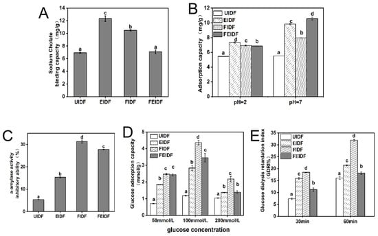 The sodium cholate-binding capacity (SCBC) of dietary fiber is crucial for determining its ability to lower cholesterol. The SCBCs of IDFs from rice bran samples under different treatments are displayed in Figure 4A. The figure indicates that FEIDF’s sodium cholate-adsorption capacity is not notably different from that of UIDF. The two treatments, extrusion and fermentation, significantly improved the effect of IDF on sodium cholate. EIDF and FIDF demonstrated increases of 43.7 and 33.8% (p < 0.05) over UIDF, respectively, significantly enhancing the SCBS of rice bran IDF samples subjected to extrusion and fermentation. The SCBC value of rice bran IDF surpasses that of wheat bran (3.2 mg/g) and soybean bran (3.5 mg/g) [50], particularly for EIDF and FIDF, indicating its potential as a functional component for reducing cholesterol levels in vivo.