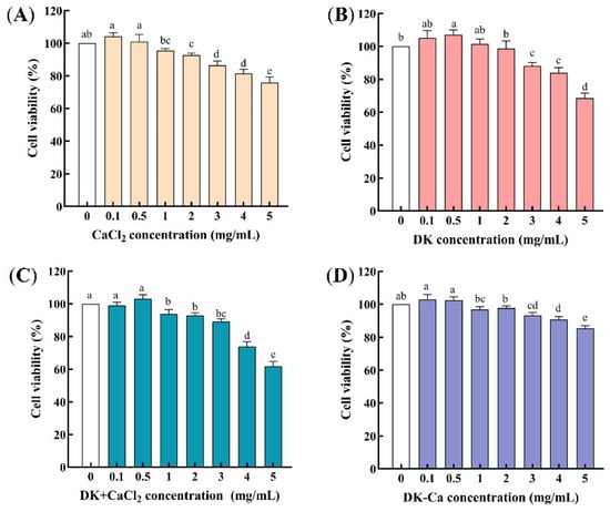(A) Effect of different concentrations of CaCl2 on the cell viability of Caco-2 cells; (B) Effect of different concentrations of DEEENDQVK (DK) on the cell viability of Caco-2 cells; (C) Effect of different concentrations of DEEENDQVK + CaCl2 (DK + CaCl2) on the cell viability of Caco-2 cells; (D) Effect of different concentrations of DEEENDQVK–calcium complex (DK–Ca) on the cell viability of Caco-2 cells. Different lowercase letters indicate significant differences among different concentrations (p < 0.05, n = 3).