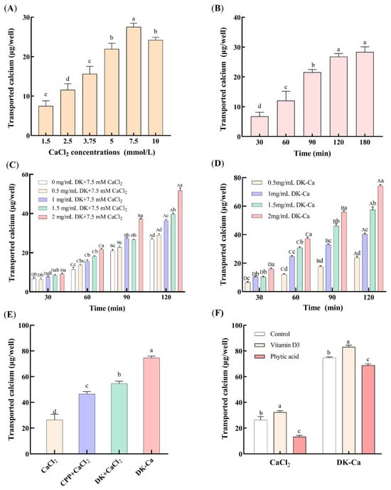 Effect of various factors on transported calcium. (A) CaCl2 concentration, (B) CaCl2 transport time, (C) different concentrations of DK + 7.5 mM CaCl2 during calcium transport-promoting process, (D) different concentrations of DK–Ca during calcium transport-promoting process, (E) different samples, (F) different dietary components. The control group contained only CaCl2 or DK–Ca, without addition of vitamin D3 and phytic acid. Different lowercase letters indicate significant differences among different groups (p < 0.05, n = 3). For (C) and (D), different lowercase letters indicate significant differences among different concentrations at the same time point (p < 0.05, n = 3); different uppercase letters indicate statistically significant differences among different time points at the same concentration (p < 0.05, n = 3).