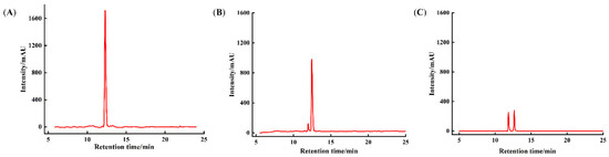 The AP side received 2 mg/mL DK–Ca solution while the BL side contained 1.5 mL prewarmed HBSS. Following incubation for 120 min at 37 °C and 5% CO2, solutions from both sides were analyzed for their component changes by reversed-phase high-performance liquid chromatography (RP-HPLC, Agilent1260, Agilent Technologies Inc., Santa Clara, CA, USA) []. Chromatographic separation occurred on a C18 column (250 mm × 4.6 mm, ACE Excel 5 SuperC18, Avantor, UK) with mobile phase A (0.1% trifluoroacetic acid in water) and mobile phase B (0.1% trifluoroacetic acid in acetonitrile). The gradient elution was programmed as follows: 0~30 min, 5% to 35% B, and 30~33 min, 35% to 100% B. The flow rate was set at 0.8 mL/min with a 30 μL injection volume. Detection was monitored at 207 nm []. The raw DK–Ca solution before the transport experiment was used as a control.
