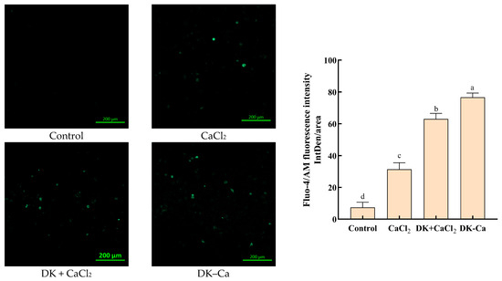 Fluorescence imaging based on intracellular calcium influx was conducted to assess the calcium transport-promoting effect in the Caco-2 monolayer following the method of Men et al. []. Log-phase cells were seeded at 1.5 × 105 cells/well in 35 mm laser confocal dishes and gently agitated to ensure uniform distribution. Cultures were maintained at 37 °C in 5% CO2 with daily medium replacement until confluent monolayers formed. Subsequently, CaCl2, DK + CaCl2, and DK–Ca solutions (each containing 150 μg/mL calcium) were added separately. The group without an added sample served as the control group. Following 24 h of incubation, the cells were washed thrice with prewarmed calcium-/magnesium-free HBSS buffer (pH 7.2). Under light-protected conditions, 200 µL of Fluo-4 AM (4 μmol/L) was applied to cover the cells. Following 30 min incubation at 37 °C and subsequent washes, cells were dark-adapted for 10 min at room temperature for de-esterification. Imaging was conducted using a confocal microscope (excitation at 496 nm, Zeiss LSM980 Airyscan2, Carl Zeiss, Germany ), followed by quantification of the fluorescence intensity with ImageJ 1.54 g software.