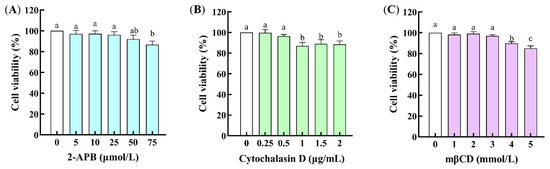 Effects of the channel regulators on the cell viability of Caco-2 cells. (A) 2-Aminoethoxydiphenyl borate (2-APB); (B) cytochalasin D; (C) methyl-β-cyclodextrin (mβCD). Different lowercase letters indicate statistically significant differences (p < 0.05, n = 3).