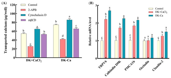 (A) Effects of different channel regulators on transported calcium. Different lowercase letters indicate significant differences among channel regulators within the same sample group (p < 0.05, n = 3). (B) Effects of different samples treated with Caco-2 monolayers for 24 h on the expression of calcium channel-related genes. Different lowercase letters indicate statistically significant differences among samples within the same gene (p < 0.05, n = 3).