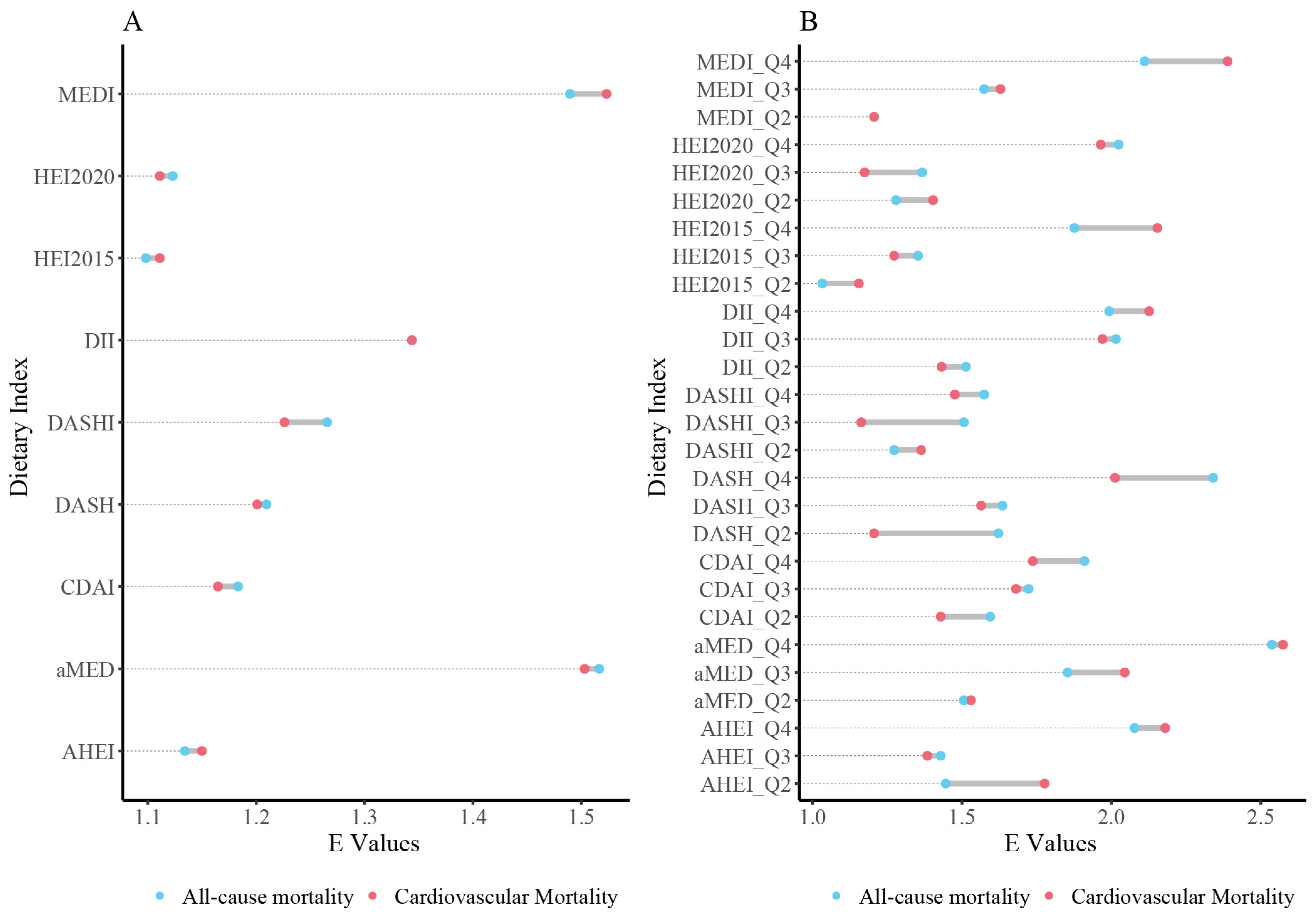 3.2. Causal Effects of Dietary Quality on Mortality Outcomes