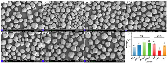 The SEM analysis revealed that the starch granules of the tested sorghum varieties predominantly exhibited irregular polygonal shapes with a minority being spherical. Notably, JZ167 and JZ169 displayed remarkably similar granule morphology. LML contained many small-sized granules, whereas JZ159 and FZ had fewer small granules than LML (Figure 1). The average granule sizes of WSS and JSS were 13.14–17.19 μm and 15.19–18.27 μm, respectively (Figure 1).