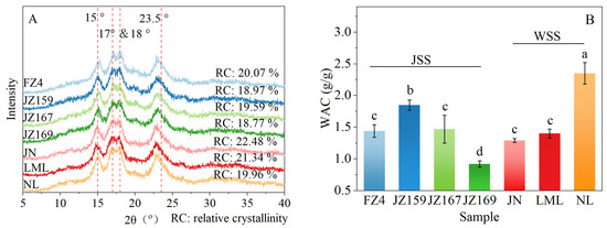 X-ray diffraction patterns (A) and WAC (B) of starches from different sorghum cultivars. Different letters indicate significant differences (p < 0.05).