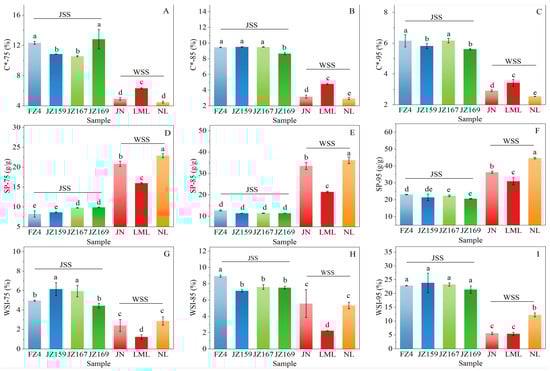 The WAC of WSS samples was 1.29–2.35 g/g, and JZ159 had the highest value (2.35 g/g; Figure 2B). The WAC of JSS samples was 0.92–1.85 g/g, and NL had the highest value (1.85 g/g). Figure 3 shows the variations in the C*, SP, and WSI values of the tested samples at various temperatures. Although overall C* decreased with increasing temperature, the C* trends of the JSS samples varied based on the temperature (Figure 3A–C). At 75–95 °C, C* was significantly lower in WSS than in JSS (p < 0.05). The C* of WSS samples remained consistent regardless of temperature.