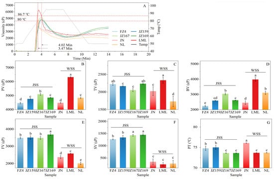 Pasting properties of starches from different sorghum cultivars: (A): pasting curves; (B): peak viscosity (PV); (C): trough viscosity (TV); (D): breakdown viscosity (BV); (E): final viscosity (FV); (F): Setback viscosity (SV); (G): pasting temperature (PT). Different letters indicate significant differences (p < 0.05). In Figure (A), 3.47 Min and 4.02 Min represent the shortest and longest time required for the test sample to generate PV, respectively; while 80 °C and 86.7 °C correspond to the lowest and highest temperatures at which PV formed, respectively.