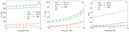 Figure 5A–C show the variation in storage modulus (G′), loss modulus (G″), and loss tangent (tan δ) of the samples, along with their frequencies. JSS samples had significantly higher G′ and G″ values than WSS samples (Figure 5A,B). The values of G′, G′′, and tan δ for all tested varieties at 1.0 Hz are presented in Table 4. The rheological characteristics of JSS samples differed from those of WSS samples. The G′ values of JSS samples were 793.81–961.29 Pa, with FZ4 exhibiting the highest value (961.29 Pa). The tan δ values of JSS samples were 0.03–0.04, showing no significant interspecific variation (p > 0.05). Conversely, the G′ and tan δ values of WSS samples were 12.12–87.97 Pa and 0.11–0.54, respectively. The tan δ values of WSS samples were significant (p < 0.05), whereas the G′ and G″ values were not (p > 0.05).