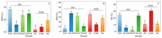 Starch digestion fractions of starch from different sorghum cultivars. (A): Rapidly digestible starch (RDS); (B): slowly digestible starch (SDS); (C): resistant starch (RS). Different letters indicate significant differences (p < 0.05).