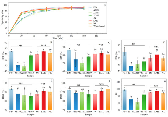 In vitro digestion characteristics of starch from different sorghum cultivars. (A): digestion curve; (B–F): digestibility from 30 to 180 min; (G): pGI. Different letters indicate significant differences (p < 0.05).