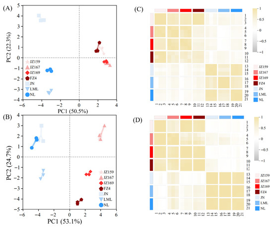 Results of Principal Component Analysis. (A,B) Composed of chemical composition and particle size from Table 1 and Figure 1, thermal properties from Table 2, and hydration properties from Figure 3. (C,D) Composed of pasting properties and digestion properties from Figure 4, Figure 6 and Figure 7.