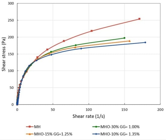 Shear stress (Pa) vs. shear rate (s−1) for MH, MHO-10%, MHO-15%, and MHO-30% at the selected GG concentrations (1.35%, 1.25%, and 1.00%, respectively).