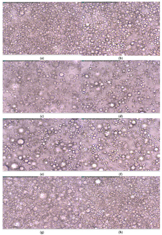 The microstructure was analyzed using an OLYMPUS CX23 optical microscope (Olympus, Tokyo, Japan) with a 40× magnification [27]. The samples were examined at the time of preparation and after 3 months of storage.