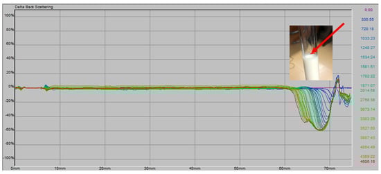 The stability of the formulations was evaluated using a vertical optical analyzer (Turbiscan Classic MA2000, Formulaction, Toulouse, France). The emulsions were placed in a cylindrical glass cell (80 mm) to record the Backscattering (BS) profile as a function of height of the cell. Measurements were taken weekly for 3 months. As a stability parameter, the variation in Backscattering, |∆BS|, was considered between the measurement at three months and the initial time (t0) for the 20–50 mm region of the cell containing the sample. The results show the variation in the profile over time [26].