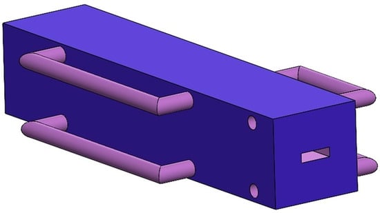 The die design schemes were modeled in 3D, with the cooling die created using the professional modeling software SolidWorks 2022. The die’s external dimensions are 318 mm × 70 mm × 65 mm. The cooling water flow channels are arranged in serpentine and straight-line configurations. The internal exit cross-sectional dimensions of the three protein melt flow channels are as follows: rectangular (24 mm × 7 mm), circular (φ, diameter = 14.64 mm), and square (12.96 mm × 12.96 mm). The modeling results are shown in Figure 2.